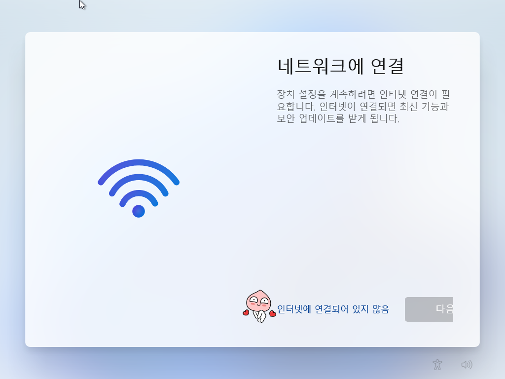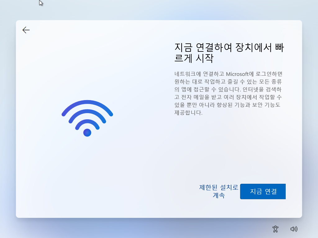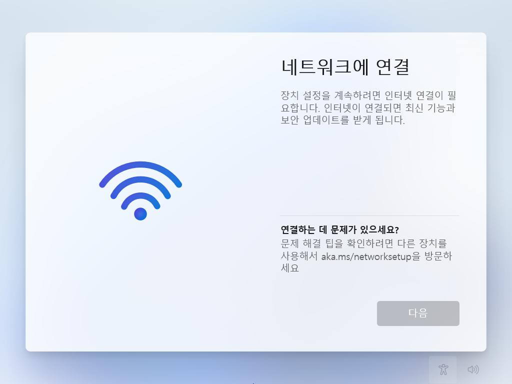 노트북 등의 컴퓨터에서 윈도우11 (Win11 22H2) 재설치시, (유선) 네트워크 연결이 되어 있지 않고, 무선랜 드라이버가 기본으로 설치 되지 않는 경우 (주로 새로 나온 무선랜 장비에서 발생), 네트워크에 연결 화면에서 넘어가지 않는 이슈가 있습니다.