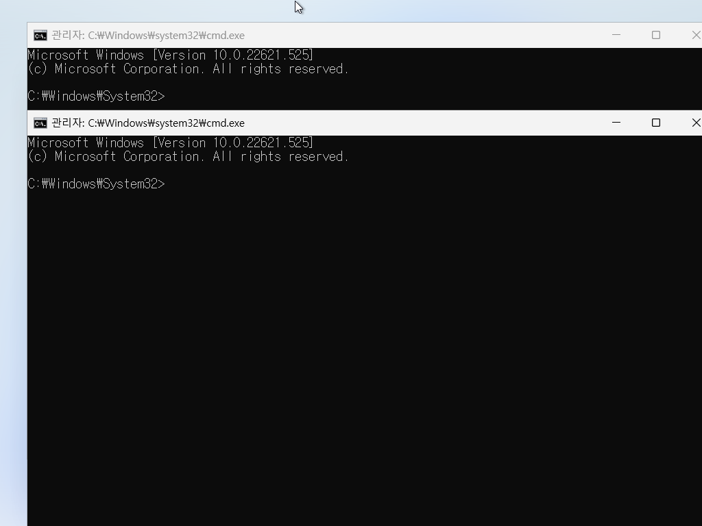 1. Shift + F10 을 눌러서 명령 프롬프트 화면을 띄웁니다. 입력은 한 번만 하세요.. 여러 번 누르면 창이 여러 개 한꺼번에 나옵니다. 아래는 두 번 눌러서 창이 두 개가 나왔는데, 하나만 남기고 닫으면 됩니다.