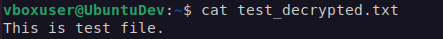 커맨드 실행 후에 생성된 test_decrypted.txt 파일을 열어보면, test.txt 파일과 같은 내용이 있음을 확인할 수 있습니다.