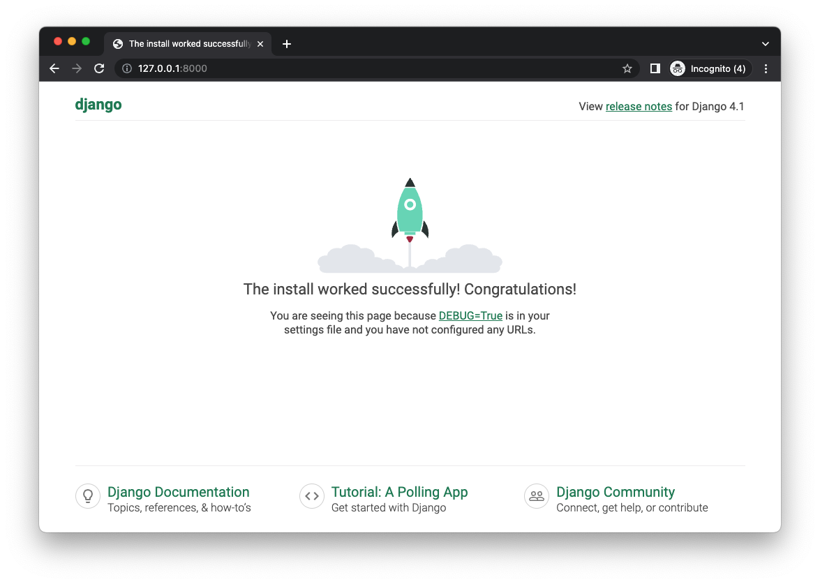그리고 아래 명령을 이용해서 Django 모듈을 설치합니다. 이 글을 작성하는 시점에서는 4.1.2 버전이 최신입니다.