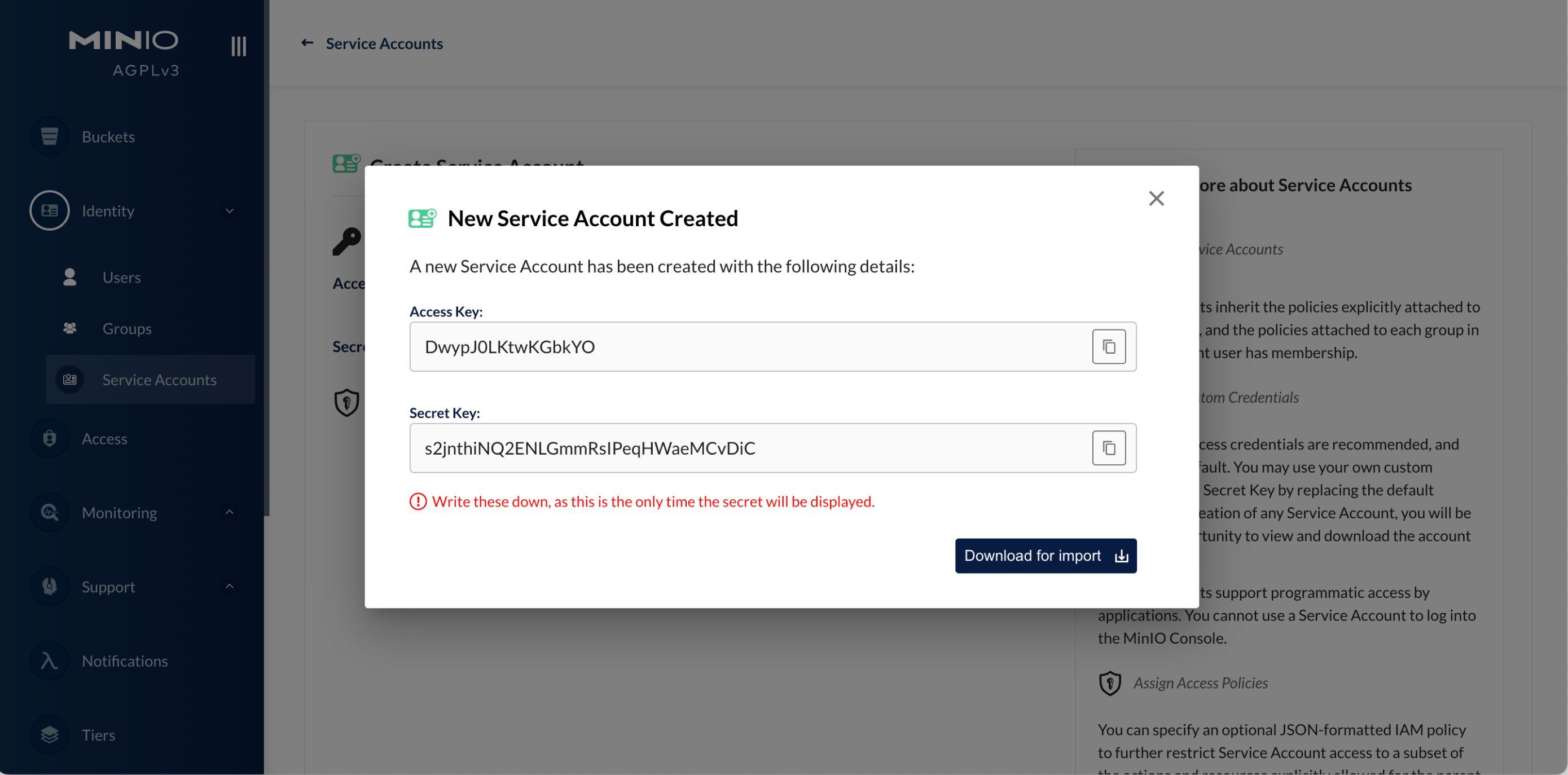 화면 오른쪽 상단에 있는 Create service account 버튼을 클릭합니다. 아래와 같이 Access Key와 Secret Key가 생성됩니다.