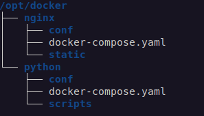 기본적으로 /opt/docker 폴더에서 각각의 서비스 컨테이너에 대한 폴더를 생성합니다. (nginx, python)